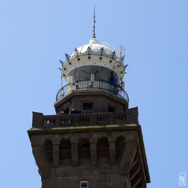 Up on the square granite tower at 56 m is a walkable overhanging cornice. Above it a granite base is supporting the white steel lantern house, including a nice decoration. Its light has a range of 25 milles (46.3 km).