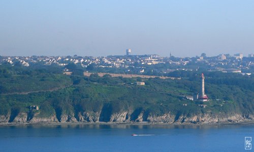 La pointe des Espagnols donne une vue sur l’autre côté du Goulet : ici la partie ouest de la ville de Brest et le phare du Portzic. Sous le phare et à gauche de la photo ci-dessus, des bunkers Allemands apparaissent encore sous la végétation.