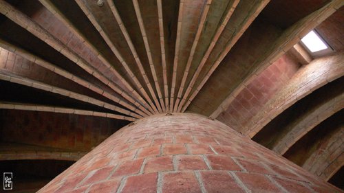 Les arcs caténaires se rassemblent autour des cages d’escalier cylindriques et sont également reliés par une épine en briques à leur point le plus haut.