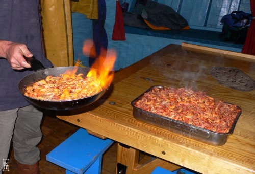 The shrimp are cooked then flambé with various alcohols. We elect pastis as the best tasting.